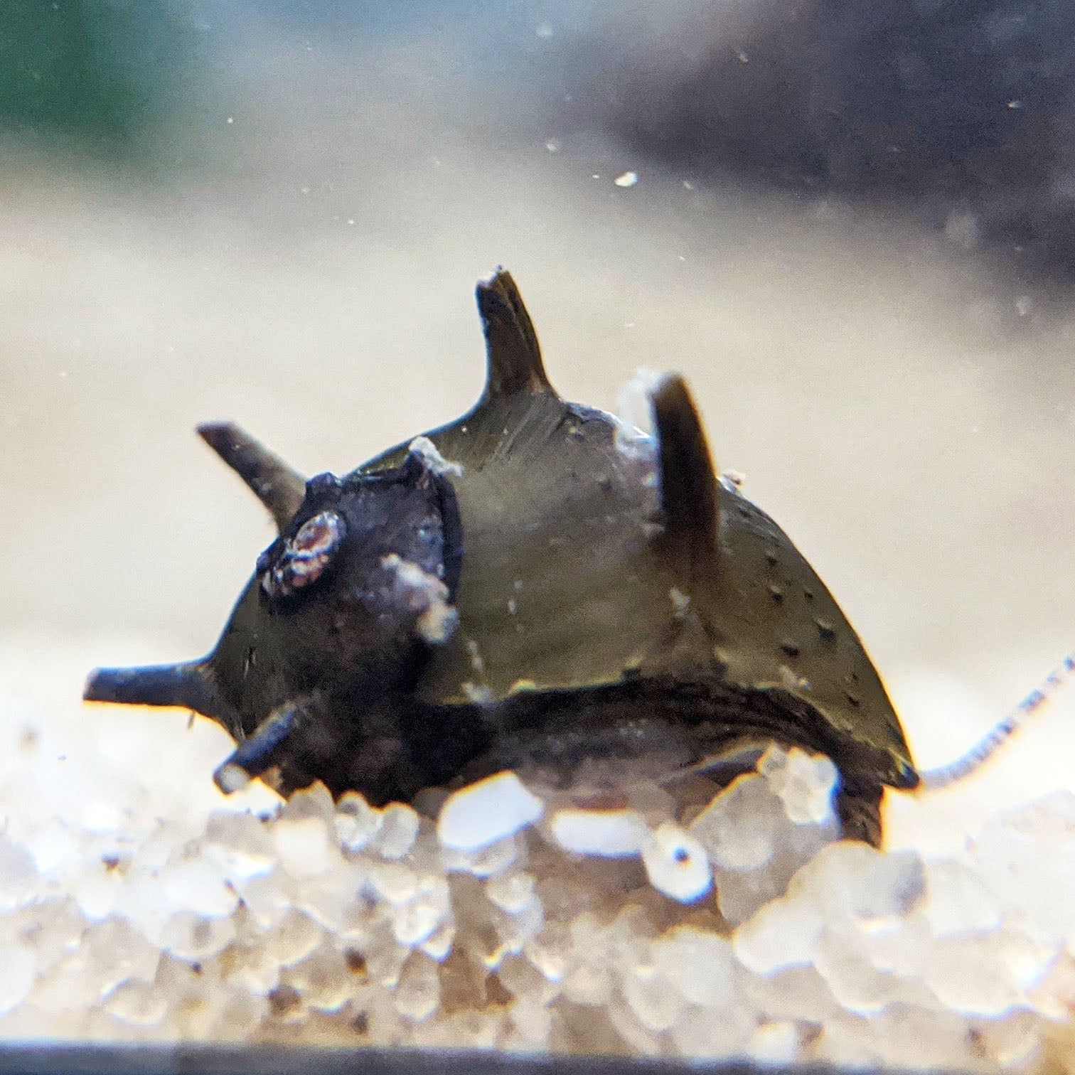 These Horned Nerite snails are not only beautiful but they are great algae eaters. This variety will come in Black or Dark Green in color. They eat algae off of aquarium walls, plants and substrate. These snails are also peaceful creatures will not bother other tank inhabitants. We sell our snails at around 1/2 inch in diameter.